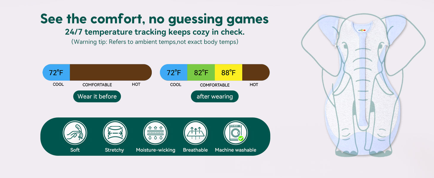 Simplify swaddle transition and keep baby comfy with breathable fabric, zip-off sleeves, and instant temp feedback.
