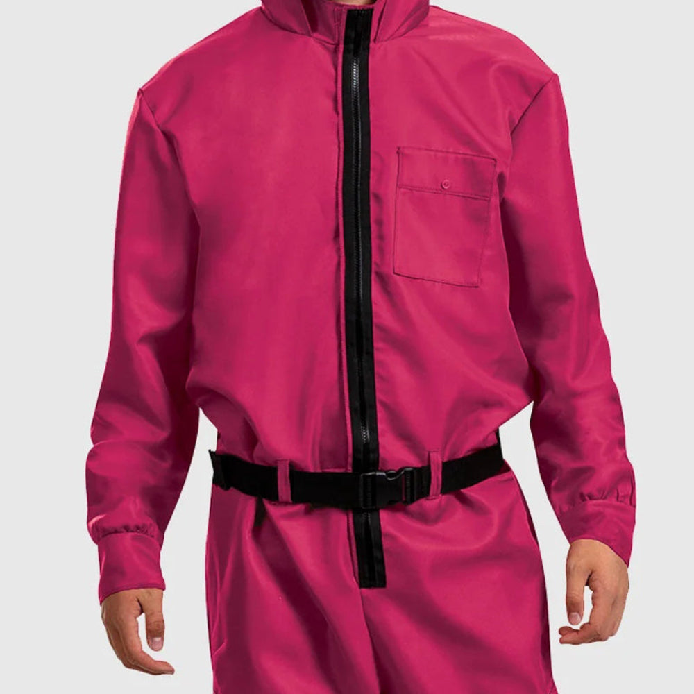 Step into the ultimate survival challenge with this premium costume jumpsuit featuring an iconic guard outfit design. This complete 2-piece costume set includes a full-body jumpsuit with belt and a distinctive mask with triangle symbol, perfect for making a bold statement at costume parties, cosplay events, or themed celebrations. Crafted from durable uniform cloth and polyester blend, this hot pink jumpsuit costume delivers authentic style and all-day comfort. Available in sizes XS through 4XL, this adult cosplay outfit fits true to size and transforms you into a memorable character from the legendary survival series.
