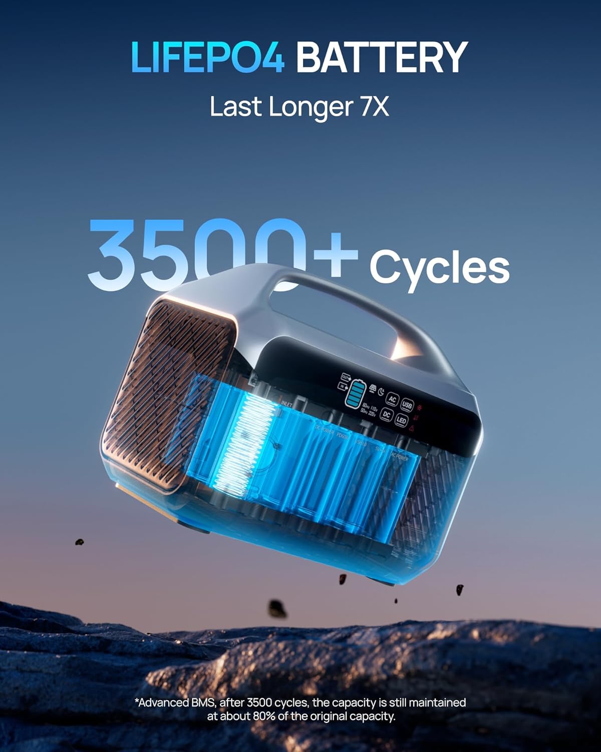 • LiFePO4 Battery 576Wh (180,000mAh): Built with durable LiFePO4 battery cells, this power station offers over 3,500 charge cycles and maintains 70% capacity even after 10 years.