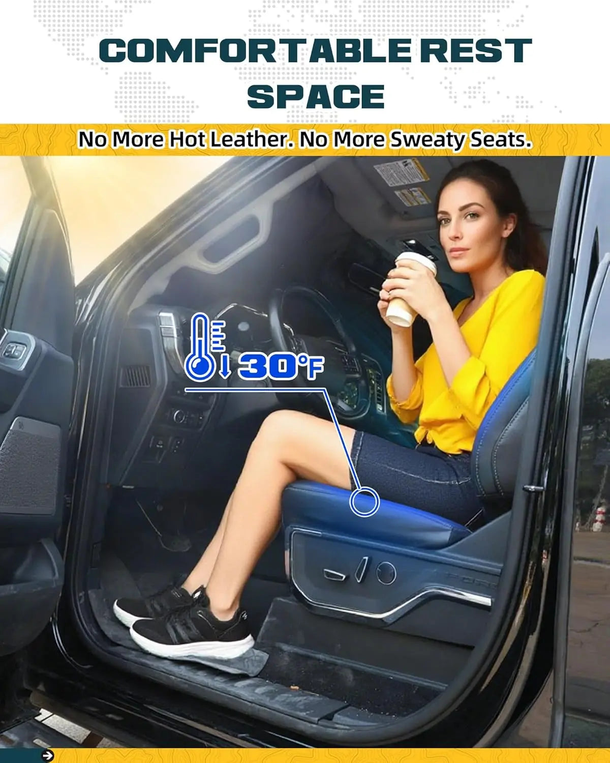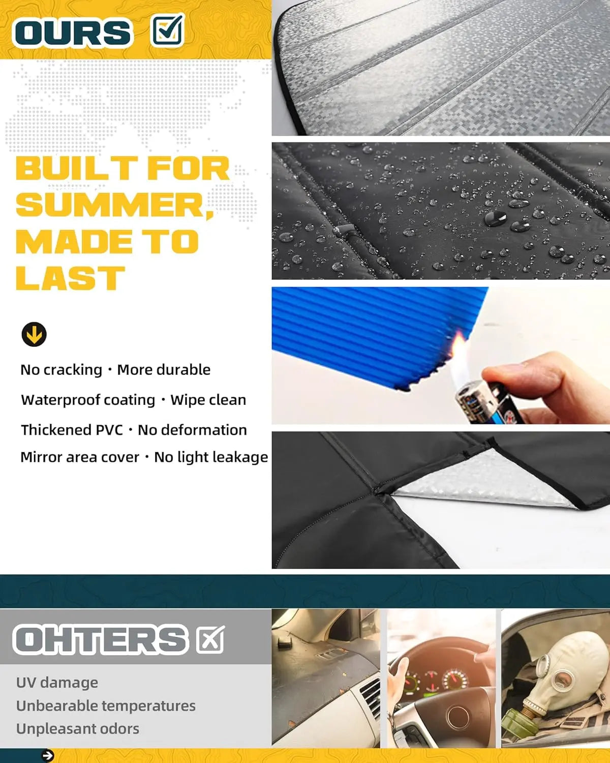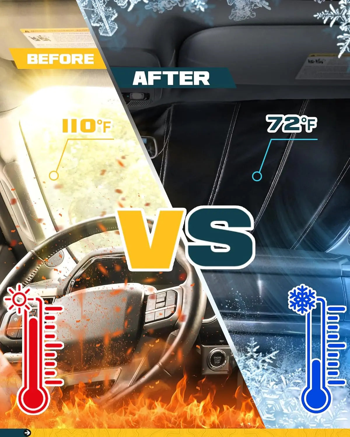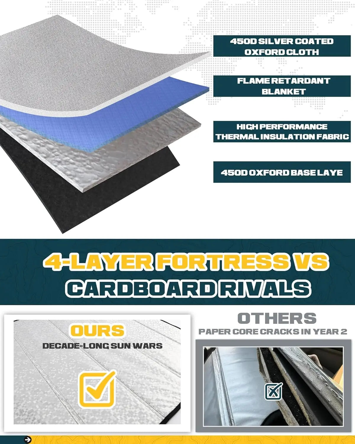 • 4-Layer Military-Grade Insulation: Silver-coated Oxford fabric + rigid PVC panel + ThermoLock tech fabric + reinforced Oxford base. Lab-tested to block 99% UV rays and reduce cabin temps by 20℉. Keeps ice unmelted for 3+ hours in heat, retains warmth in winter