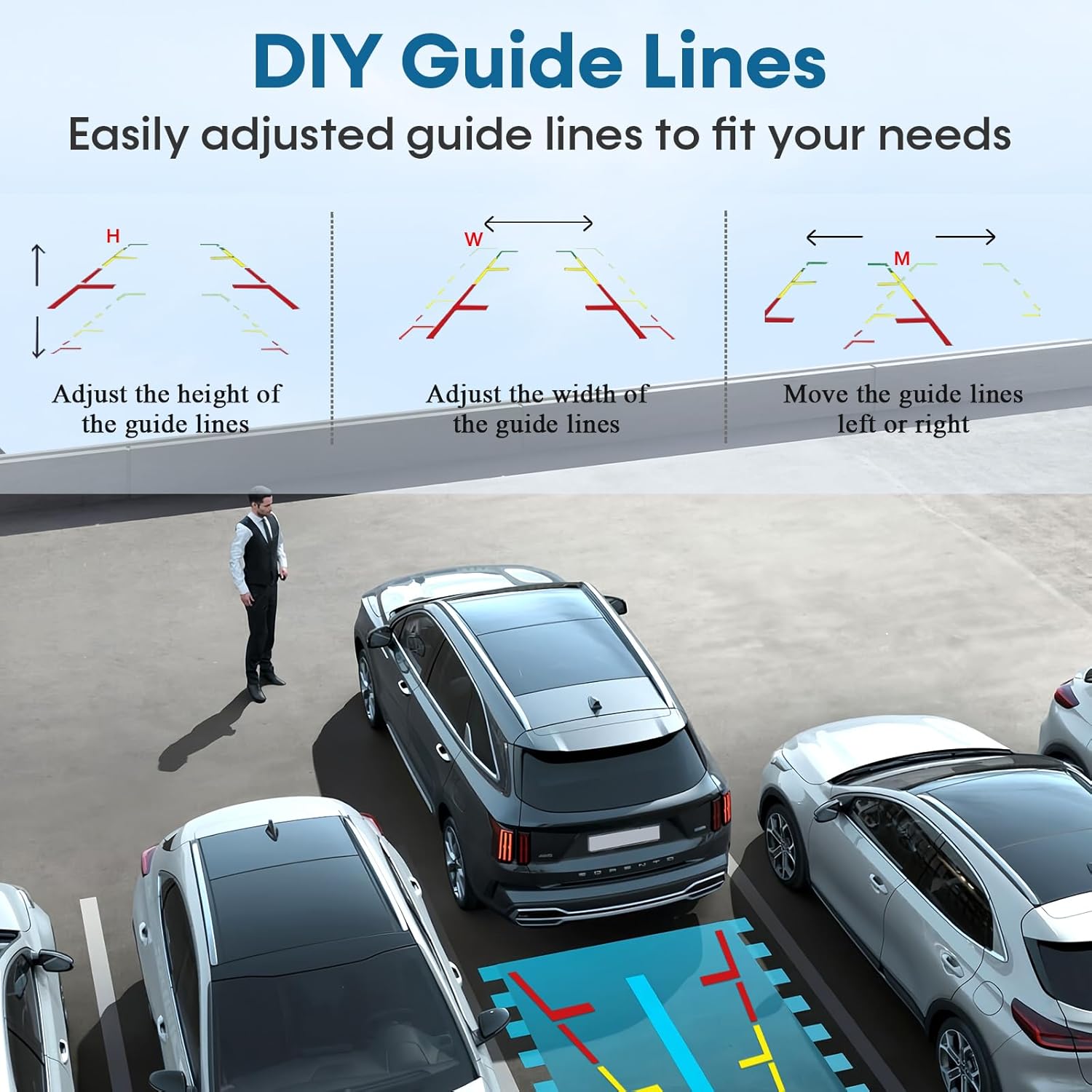 • Customizable parking lines – Park with pinpoint accuracy: Never miss the perfect parking spot again. The Customizable Parking Lines allow you to adjust the grid lines on your screen for better alignment. Easily move them up, down, left, or right to fit your vehicle’s dimensions, giving you a precise visual aid for reversing