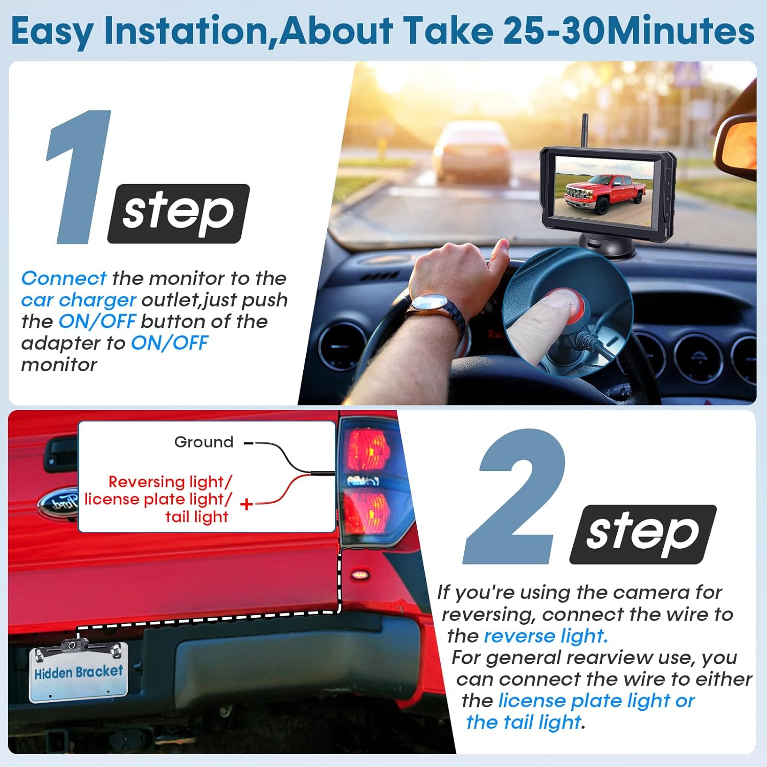 • Easy installation with no Drilling required – Secure and stylish: Enjoy hassle-free installation with no drilling needed. This wireless back up camera mounts easily behind your license plate, offering a secure and discreet setup that won’t damage your vehicle’s finish. Keep your vehicle looking sleek and modern while ensuring maximum functionality and safety